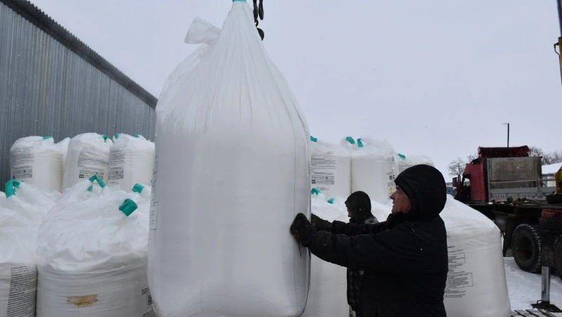 В эти февральские дни в ООО «Агропредприятие «Потудань» ни на минуту не прекращается ремонт техники и заготовка минеральных удобрений. На ток то и дело подъезжают гружёные аммиачной селитрой КамАЗы. На то, чтобы зацепить крюком два девятисоткилограммовых мешка, у рабочих уходит десяток секунд. Знак «вира» автомобилисту-крановщику, и мешки устремляются ввысь, опускаясь на поддоны.