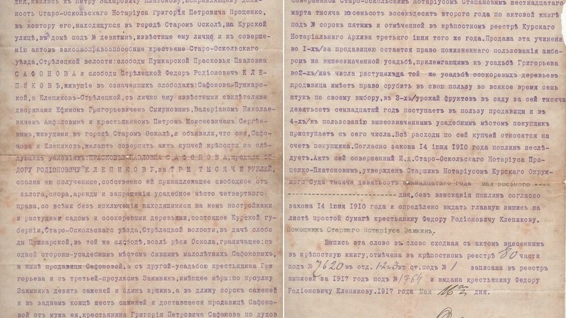 Сделка совершалась в Старом Осколе, на Курской улице, в доме № 9, у Петра Захаровича Платонова, исполняющего должность старооскольского нотариуса Григория Петровича Проценко.