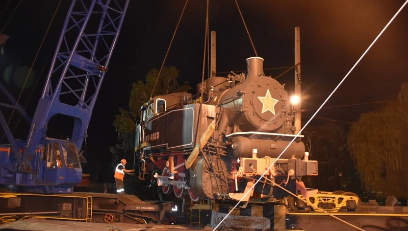 С замиранием сердца пришлось наблюдать, как медленно разворачивался, поднимая ввысь 25-метровую стрелу, 125-тонный железнодорожный кран ЕДК-1000, стараясь не задеть высоковольтные опоры. Затем также медленно он поднимал с постамента 45-тонный маневровый танк-паровоз 9П-9123, который стоял у локомотивного депо с 1996 года. Установлен он был в честь100-летнего юбилея подразделения РЖД.