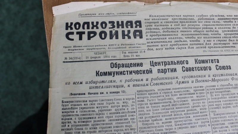 Другой номер, который мне довелось почитать, за 18 февраля 1954 года. «Колхозная стройка» уже являлась органом Шаталовского райкома КПСС и районного совета депутатов трудящихся Белгородской области. На всю первую полосу – Обращение ЦК КПСС ко всем избирателям СССР с просьбой принять участие в предстоящих выборах. По сути, вся газета посвящена этой теме. К слову, ни в одном из номеров, я не увидела каким тиражом выходила «Колхозная стройка».