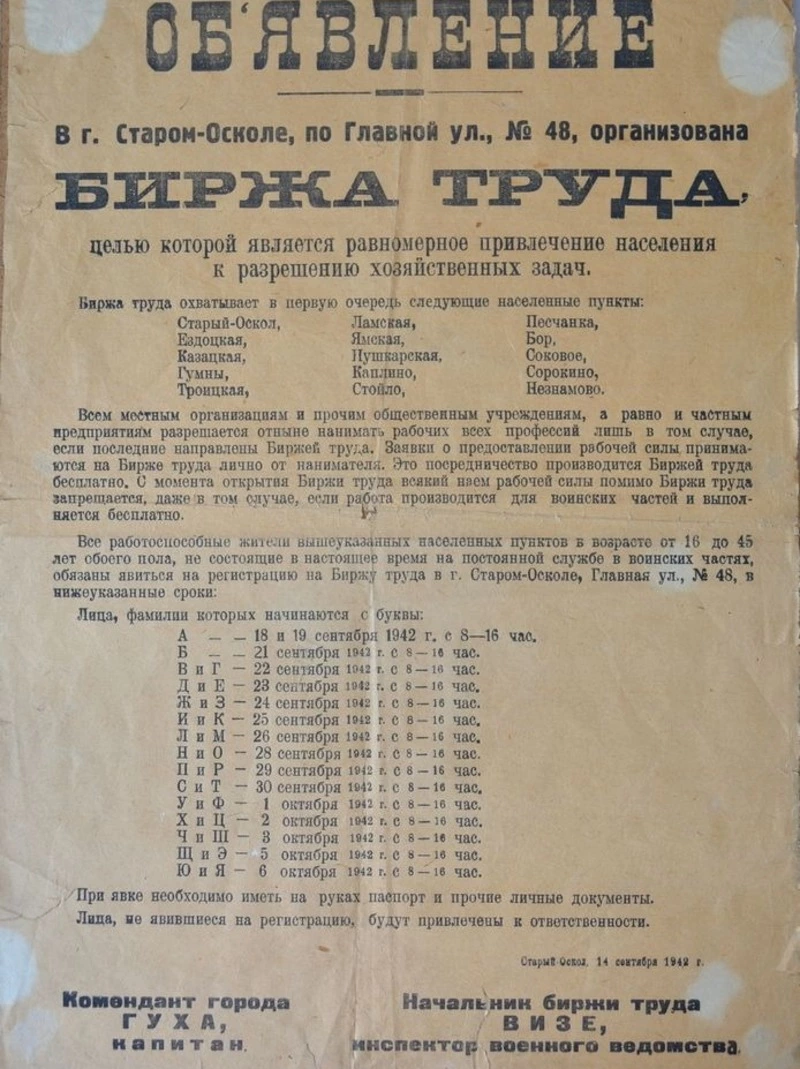 14 сентября в городе и окрестных сёлах развесили объявление за подписью коменданта города Гуха и инспектора военного ведомства Визе. В объявлении говорилось: «В городе Старом Осколе по Главной улице, дом № 48, организована Биржа труда, целью которой является равномерное привлечение мирного населения к разрешению хозяйственных задач». Трудоспособное население от 16 до 45 лет под строгую ответственность обязано было явиться на Биржу труда для регистрации в установленный срок. За время оккупации было угнано на принудительные работы в Германию 2737 старооскольцев.