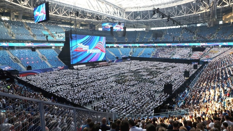 Хор располагался на трибунах, а оркестры – на поле арены. Среди музыкантов были Оркестр XXI века под управлением Павла Овсянникова и Балтийский симфонический оркестр. В состав хора вошли, в частности, Государственная академическая хоровая капелла России им. А.А. Юрлова, ансамбль песни и пляски Российской армии им. А.В. Александрова, Академический хор русской песни под руководством Николая Азарова.