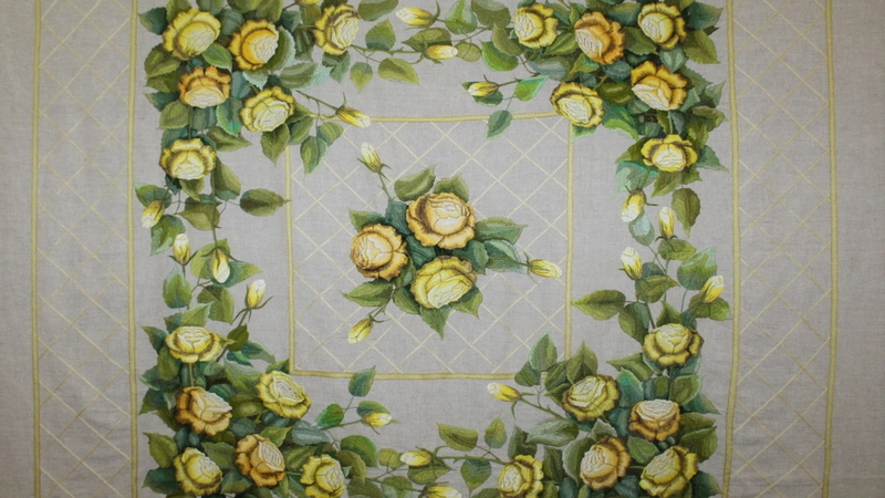 Сложно поверить, что в работе «Розовая поляна» использовано 79 оттенков зелёного и 36 оттенков жёлтого. Нитки для неё мастерица собирала и покупала в разных местах и городах на протяжении трёх лет.
