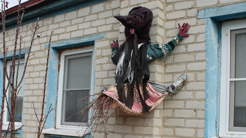 Вот Ведьмочка на метле, которая приземлилась на фасаде дома. Как шутят сами хозяева, не рассчитала скорость и её немножко расплющило о стену. Старый свитер супруга, шляпа из картона, обшитая чёрной тканью, незамысловатая юбочка и кроссовки – вот и весь наряд сказочной дамы.