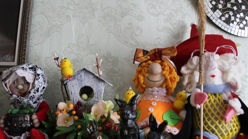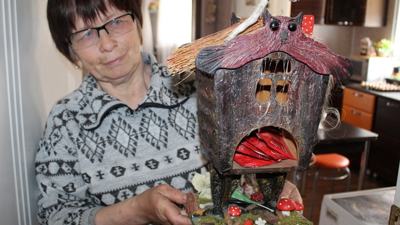 Работами хозяйки уставлена каждая полочка в комнатах дома. Даже настенные часы изготовлены своими руками. Чайные домики на кухне сделаны в форме русской печи, на которой лежит Емеля, и избушки Бабы-Яги. А ещё у неё есть хрустальные туфельки из любимого фильма «Золушка». Они выполнены из плотного прозрачного полиэтилена, который Галина нагревала на огне, чтобы придать нужную форму.