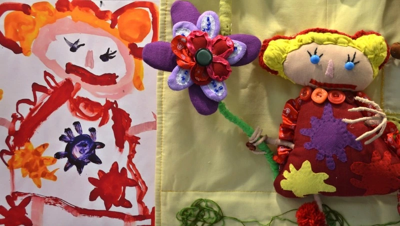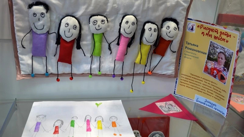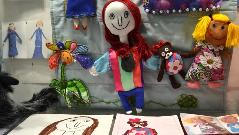 Выставку вдохновила та же идея – материализовать воображаемый мир, который создают девчонки и мальчишки. 12 педагогов-кукольниц из различных городов России, вдохновлённые детскими рисунками, сшили сто кукол, игрушек и панно. Их объединила автор проекта – народный мастер Пермского края Ирина Хабышева. Она же представила его в прошлом году на международном фестивале лоскутного шитья фестиваля «Душа России» в Москве. Затем выставка отправилась по городам России.