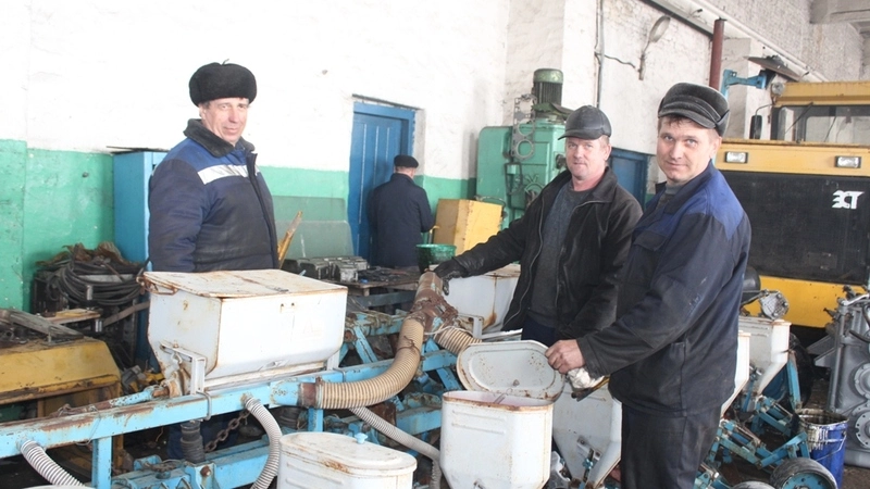 А механизаторы Владимир Репрынцев, Павел Зубков и Сергей Селютин проверяли исправность секций сеялки для подсолнечника и кукурузы.
