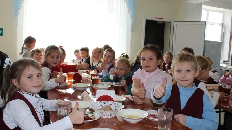 Вдоволь насытившись, малыши спешат на урок. Дежурные собирают посуду, протирают столы. Очередь кормить обедом старшеклассников…