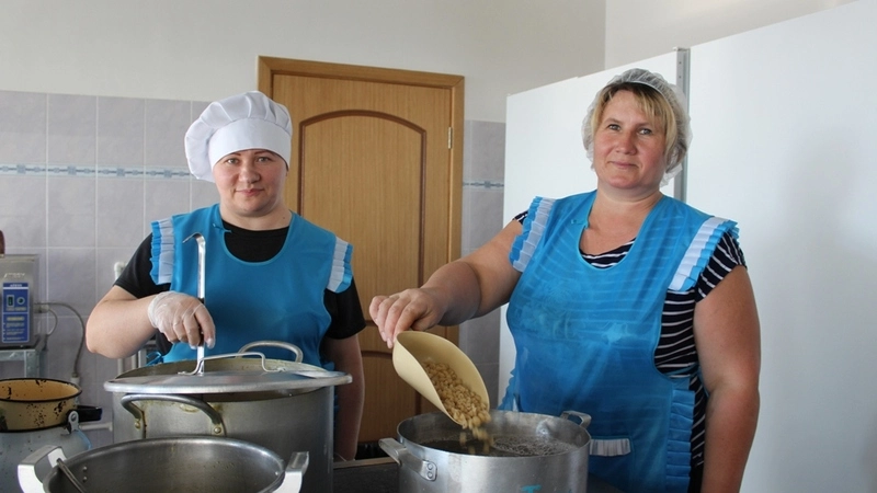 Ежедневно Людмила Николаевна и Ольга Сергеевна кормят 113 ребят. Времени на отдых практически нет. Перекинуться последними новостями успевают во время работы.