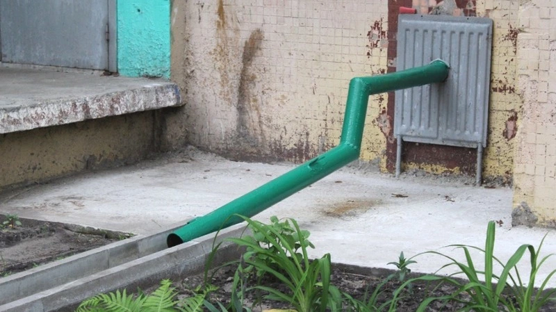 Жителям также не понятно, почему строители у одних подъездов сделали трубы, по которым вода с крыши поступает в ливневые лотки, а у других нет. В результате дождевая влага выливается на тротуар, зимой в этих местах образовывались катки. Людям пришлось самим соорудить трубы из подручных материалов – получились конструкции различных форм, не украшающие двор.