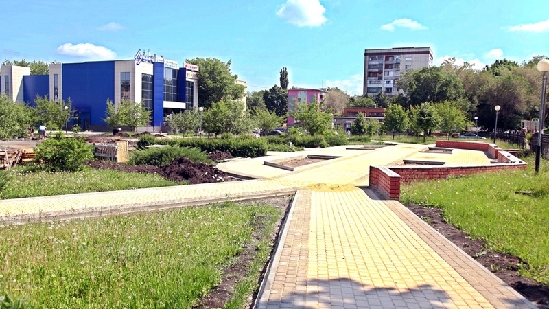 Быстрыми темпами ведётся кладка тротуарной плитки, ей занимается отдельная бригада, приехавшая из Строителя, материалы подвозятся бесперебойно. Её заменили почти на половине площади сквера – на дорожках и площадках. Сейчас рабочие выкладывают её в глубине территории – там, где планируется обустроить большую детскую игровую площадку. Бригадир плиточников уверенно заявляет, что его рабочие завершат укладку до конца июня. Сделали бы и раньше, но сдерживает фонтан, который они сейчас разбирают. Дело это непростое, так как конструкция изготовлена на века, из железобетона. А новый фонтан планируется смонтировать до конца июля.