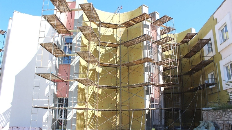 Заметно преобразился фасад здания. Дизайнеры сохранили привычный нам светлый колорит, но технологии отделки применяются современные. После утепления строители наносят декоративную штукатурку «короед» на основную часть фасада, а некоторые участки отделывают керамогранитом. Привлекает внимание графическое обрамление окон.