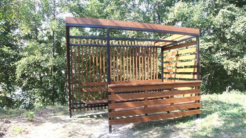 Мост надёжно стоит на металлических опорах, соединённых металлоконструкциями. На них проложен настил из толстых деревянных брусов, по которым может проехать лёгкая машина типа «Газели». Кстати, небольшой «УАЗик» с кузовом уже находится на острове и помогает строителям при перевозке материалов и спиленных веток. Сход с мостика на остров завершается бетонированной площадкой.
