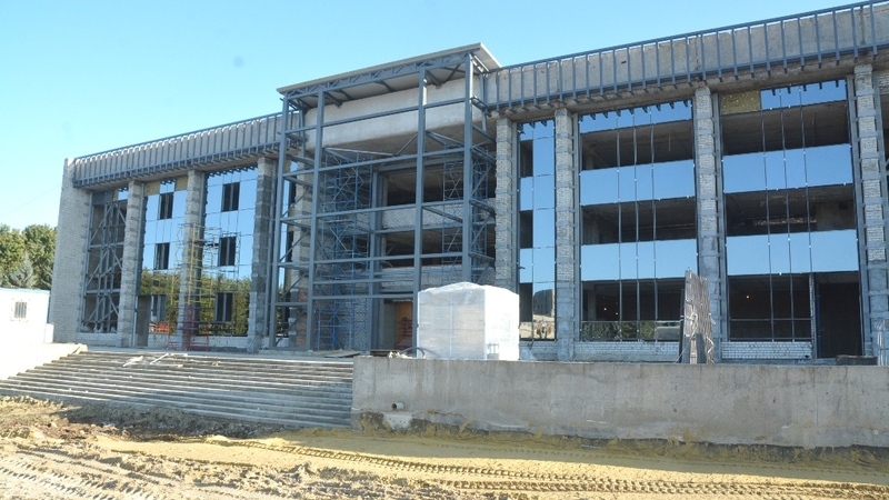 В здании дворца устанавливают также окна, а на прилегающей территории ведут благоустройство.