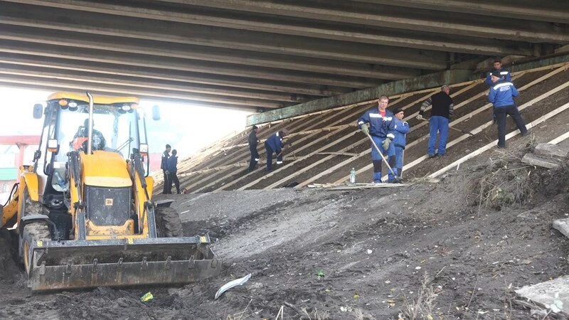 Одновременно началось укрепление откосов земляной насыпи под путепроводом, которые ещё называют конусами. Места сопряжения насыпи с самим мостом являются опасными участками, требующими постоянного контроля и содержания в исправном состоянии. Они подвержены атмосферному воздействию, размываются и нуждаются в укреплении. На минувшей неделе рабочие «Автомоста» демонтировали старые бетонные плиты с откосов как со стороны улицы Ленина, так и со стороны юго-западного микрорайона. Возле рынка «Восточный» уже по всей площади конуса сверху донизу установлена опалубка, засыпан щебень – откос подготовлен к бетонированию. Как пояснили специалисты, работы по укреплению опор и конусов путепровода панируется завершить до холодов.