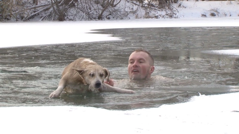 Действительно, в той стороне, куда показывали дети, была полынья, а в ней отчаянно барахталась собака. Она визжала, звала на помощь. Журналисты её бы и не услышали, если бы не дети: она была далеко, а вокруг шумно, лаяли дворовые псы. Не раздумывая ни секунды, Александр побежал к тонущему животному. По‑армейски быстро разделся и спустился в воду. На улице было минус 20. Он помог собаке подплыть к краю полыньи и выбраться на лёд. Пёс бодро встал на ноги и отряхнулся от воды всем телом.