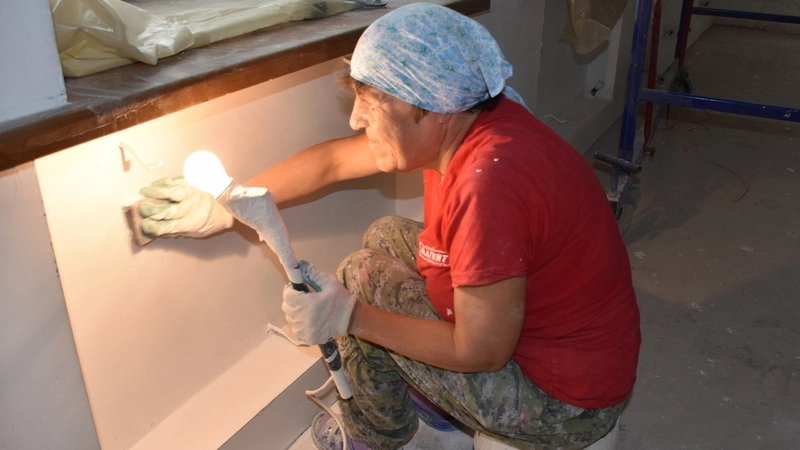 Внутри задания практически закончены все работы по отделке помещений гипсокартоном, полы залиты бетоном, и они будут отделаны керамогранитом. Сейчас здесь ведётся так называемая чистовая отделка.