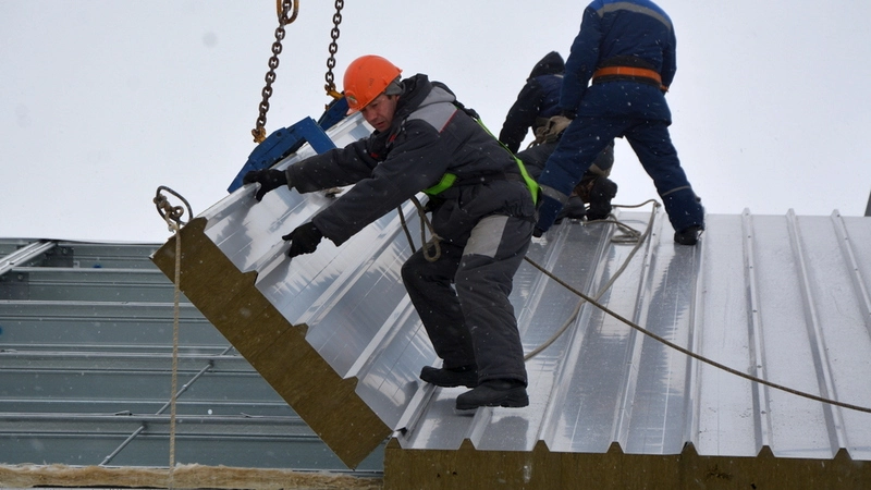 Тридцатитонный кран «Ивановец» как пушинку поднял вверх десятиметровую сэндвич-панель. Через пару минут на крыше одного из зданий её приняли рабочие. Несколько человек аккуратно, соблюдая меры безопасности, уложили полимерный материал, устойчивый к различным погодным условиям и ветрам.