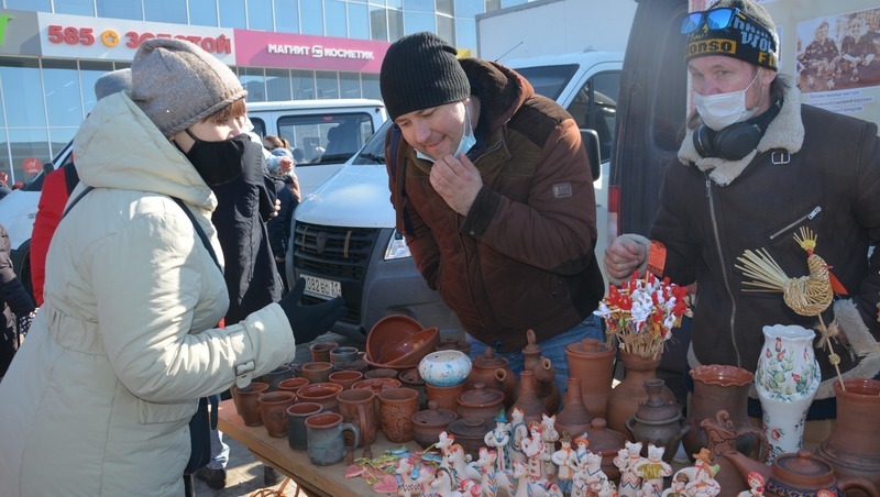 Старооскольский Центр народных промыслов представил работы гончаров, традиционную старооскольскую игрушку, соломоплетение, роспись. Рекомендовали товары покупателям два продавца.