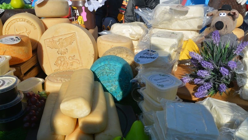 В широком ассортименте была представлена молочная продукция – пастеризованное молоко, ряженка, йогурт, творог, сметана, сливочное и шоколадное масло от ИП Исаенко из Красногвардейского района, молоко, сыры и прочее из старооскольской Дмитриевки от КФХ Владимира Николаевича Тарасова. Очень красивые сыры привезли из Бабровых Дворов Губкинского района.