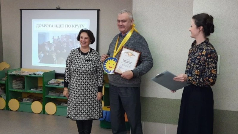 Погода права – хороший человек Сергей Трофимович! Несмотря на семейное торжество, намеченное на этот день, он нашёл время прийти в библиотеку. Отказать он не мог, ведь пригласили от чистого сердца. На память о встрече ребята подарили ему сделанный своими руками орден улыбки. Заслуженная награда!