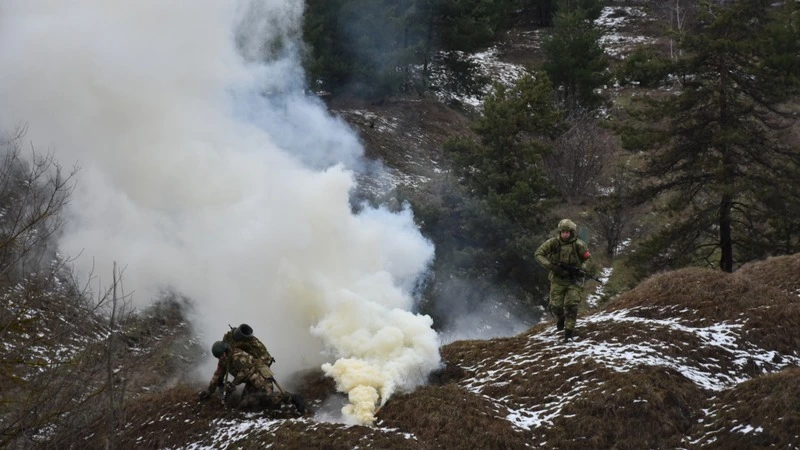 Вот и сейчас над головой слышится негромкое тарахтение, но за низкими серыми облаками очень сложно что-то разглядеть. Несколько секунд, и на земле расцветает бордовое пятно взрыва учебного боеприпаса. Шумового и дымного, но всё равно становится не по себе. Кстати, на этих учениях успешно применили и портативные системы радиоэлектронной борьбы (РЭБ). Один из летательных аппаратов условного противника был нейтрализован.