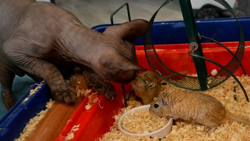Настя выпускает Зиту и Гиту побегать. К лотку их не приучишь, как и всех грызунов, поэтому надолго вне клетки зверьков не оставляют. Заметив, что мыши на свободе, приходит сфинкс Овен. Кот долго нюхает их, они – его. Кажется, что всё идеально, но внезапно кот бьёт лапой. Я пугаюсь, Настя удивляется. Ещё недавно Овен был вполне дружелюбен, спокойно наблюдал за мышиной суетой. Но недавно он научился выскакивать за дверь дома и, бывая на улице, хоть и недолго – его сразу отлавливают и возвращают – всё же, видимо, успел разбудить в себе внутреннего зверя и охотника. Так что мыши отправляются обратно, под защиту решётки.
