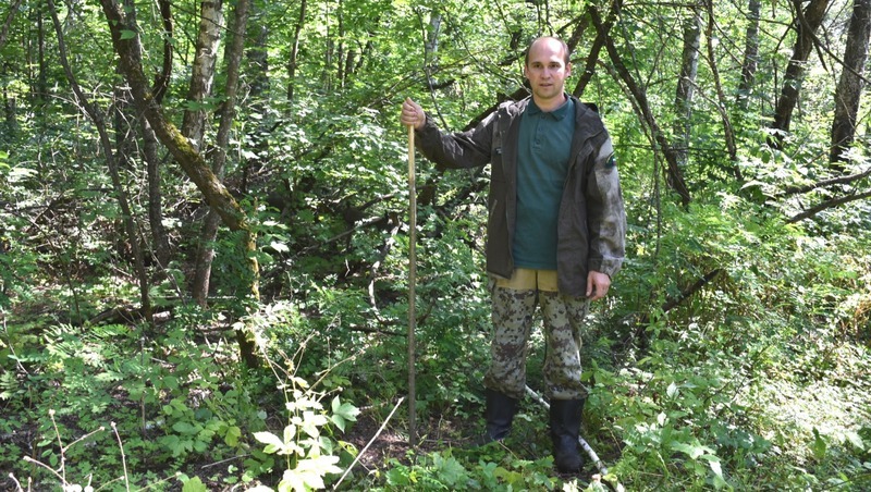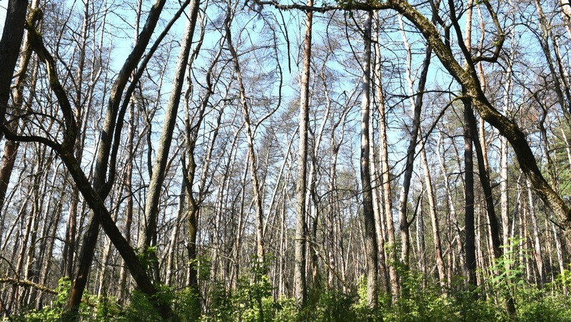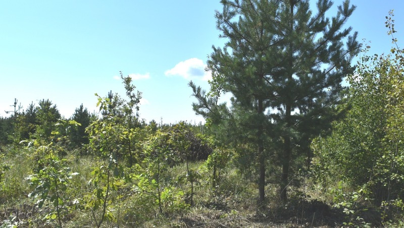В урочище Тереховская сосна пожары бушевали в печально памятном 2010 году. Они были верховые и низовые, и уничтожили более 700 га леса в округе. Конкретно в урочище, куда мы прибыли, выжгло около 300 га. Их все пришлось выпилить. Здесь уже несколько лет идут восстановительные работы. После очистки территории, в 2011 и 2012 годах, были высажены дубки и сосёнки. Однако мало их просто посадить. Природа не терпит пустоты, и пока молодые деревца набираются сил для решительного рывка вверх, их способны заглушить высокая трава, кусты, быстрорастущие породы, чья древесина не имеет ценности: берёза, осина, ясень, клён и другие. На участке в Тереховской сосне уже проводили рубки ухода. И вот, снова стремительно выросли молодые берёзки, осинки и разнообразные кусты, не говоря о траве, из которой едва видны дубки. Если не делать рубку ухода, то рост нужных пород дерева остановится, и они не будут развиваться.