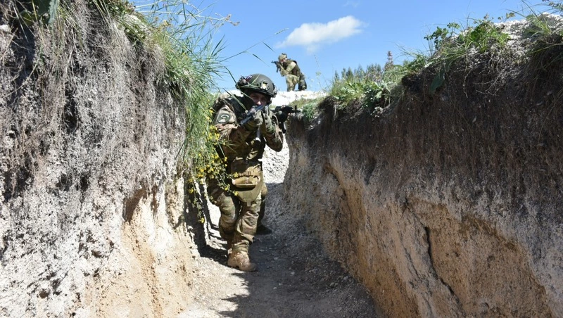 Движение тройками на поле боя – особый вид искусства. На открытой местности бойцы принимают походный порядок в форме клина, образуя равносторонний треугольник. Такое построение позволяет быстро разворачиваться в боевой порядок на противника с любой стороны, прикрывать друг друга и не перекрывать сектор ведения огня. Для троек есть множество вариантов применения в зависимости от типа местности или задач. Например, для штурма и последующей зачистки опорного пункта противника. Условная граната летит в окоп, и бойцы устремляются к цели. Один страхует на поверхности, двое, прикрывая друг друга, медленно движутся по траншее, меняя упорное плечо под приклад в зависимости от направления движения. Под ногами то и дело попадаются учебные мины «лепесток», кстати, почти незаметные в пыли. Простая на первый взгляд тактика требует постоянных тренировок.