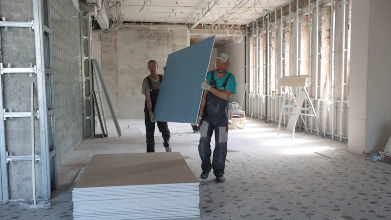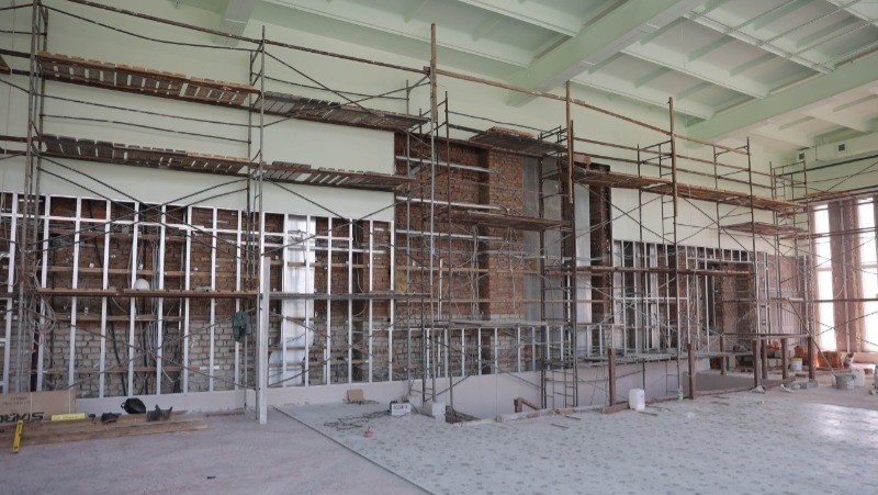 Как рассказала нашему изданию начальник ПО УКС Инна Шатохина, внутренние отделочные работы ведутся полным ходом. В стадии завершения работы по прокладке инженерных сетей водоснабжения, водоотведения, электроснабжения, вентиляции и отопления, осталось выполнить установку радиаторов отопления, светильников и санфаянса. Внутренние отделочные работы первого и второго этажей выполнены на 70%, восстановлена пристройка, в которой сейчас выполняются кровельные работы. Выполнен демонтаж облицовочного камня главного фасада. Произведена замена витража.