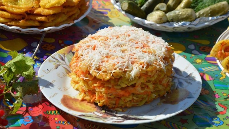 Сырой картофель натираем на тёрке, отжимаем сок. Добавляем муку, яйцо, солим и перчим. Обжариваем на сковороде коржи с двух сторон. Для начинки жарим лук с морковью. Каждый корж промазываем между собой слоями начинки, сверху посыпаем тёртым сыром. Объеденье!