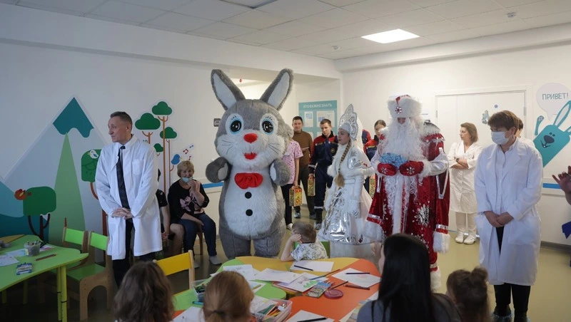 Подарки и пожелания счастливого Нового года получили 27 декабря мальчики и девочки, находящиеся в отделениях окружной детской больницы. Дедушка Мороз, по сложившейся традиции, спустился к ребятам с крыши. В сопровождении Снегурочки и сказочных персонажей он прошёл по отделениям, удивляя, радуя и настраивая ребятишек на позитивный лад.