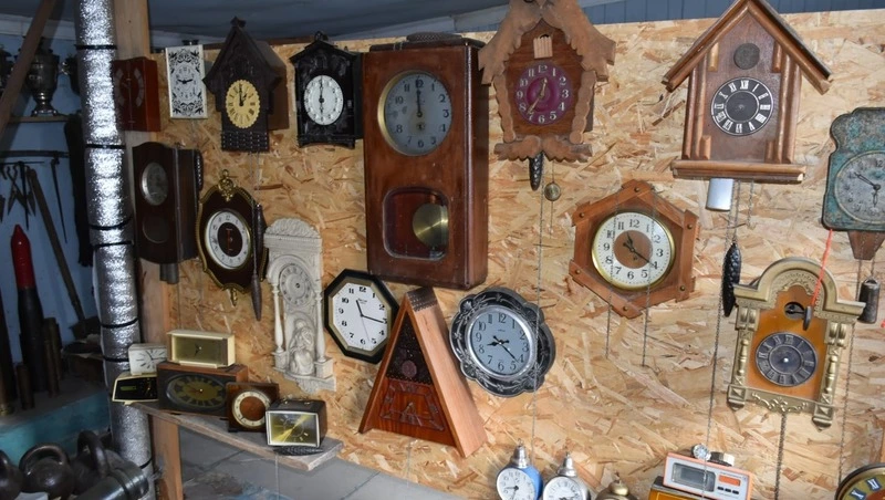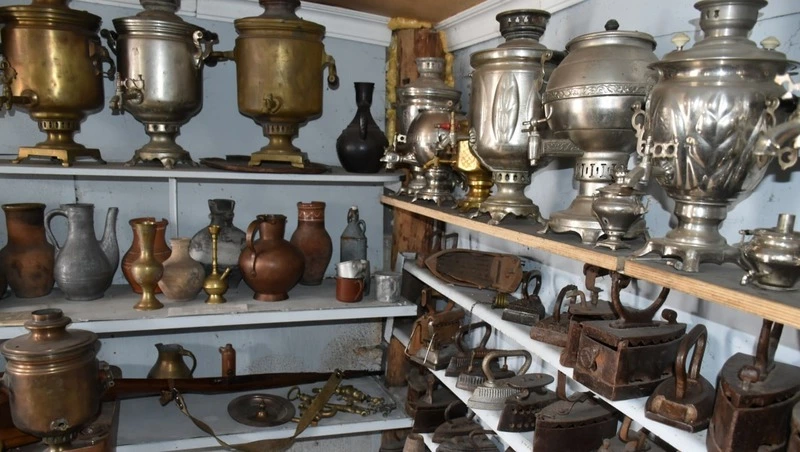 Стоит только зайти за калитку – сразу попадаешь в музей. Под специально сооружённым навесом хранятся обезвреженные снаряды и мины, старинные чемоданы, в том числе немецкого полковника, стеклянные фонари разных эпох, старинные радиоприёмники, староверские серпы и косы, боевые топоры, ухваты, чапли, ступы и т.д. Это только часть экспонатов. Другие, не менее интересные, хранятся в отдельном помещении. На собирание этой исторической коллекции у него ушёл не один десяток лет.