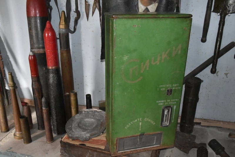 Есть в его частной коллекции советский действующий автомат для выдачи спичек. Чтобы купить их, достаточно было опустить в прорезь копейку, нажать на кнопку до отказа и получить коробку спичек. Наш «гид» это продемонстрировал.