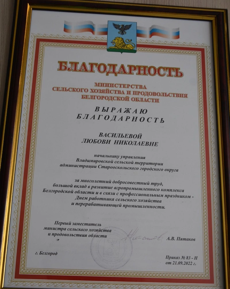 Когда в 2007 году Виктор Шабельников перешёл в Шаталовку, на посту его сменила Ольга Бондаренко. С 2008 года должность заместителя начальника управления заняла Любовь Васильева. В этом же году она решила повысить уровень своей квалификации, заочно окончив Белгородский университет потребительской кооперации. Под руководством Ольги Михайловны наша героиня трудилась 15 лет. Последние пять лет её начальником был Юрий Вячеславович Кузнецов, она благодарна ему за добрые советы и внимание. Все её наставники были чуткими и добрыми людьми. Большую помощь в работе сейчас оказывает начальник департамента агропромышленного комплекса и развития сельских территорий администрации округа Владимир Нечаев.