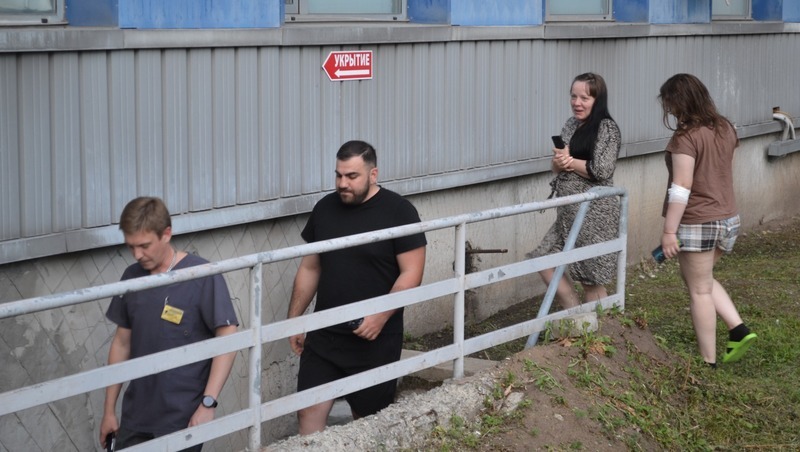 Как только раздалась сирена по внутреннему оповещению, никого из здания не выпускали, а больные и посетители в сопровождении медсестёр и врачей начали спускаться в убежища и выходить в безопасные зоны. Сложность эвакуации больницы в том, что в самом большом здании – девять этажей, лифты же отключают, чтобы в случае сбоя в работе люди не оказались заблокированы в них. За то малое время, что остаётся до прилёта ракеты, нужно вывести и вынести множество больных. Поэтому пациентов разделяют на категории, для каждой из которых свой алгоритм. Ходячие спускаются сами, средней тяжести – с помощью медсестёр и бойцов. Тяжёлых вывозят из палат на кроватях, а затем на мягких носилках уносят в убежище, которое расположено в просторном подвальном помещении. Там есть генераторы, стулья, кровати, запасы воды, пищи и медикаментов. Бойцы теробороны разошлись по этажам.