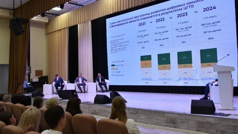 На совещание были приглашены губернатор Вячеслав Гладков, региональные министры образования и цифрового развития, главы муниципалитетов и представители системы образования округов и районов области. Проект стартовал в 2021 году по инициативе главы региона. Главная задача – изучение детьми азов информатики и программирования на внеурочных занятиях. По сути, за минувшие годы в школах области выстроена система непрерывного ИТ-обучения с 1 по 11 класс, а то и вовсе с детского сада. Закуплено современное оборудование, проводятся «Летние ИТ-школы», чемпионаты «Цифровое ГТО». Вместе с ребятами учатся и педагоги. Уникальная площадка собрала для сотрудничества и наставничества учёных, бизнес-компании, талантливых детей, проявивших высокий интерес к цифровым технологиям. Сегодня в этот внеурочный познавательный процесс вовлечено около 160 тыс. учеников и воспитанников старших групп детских садов, тысячи учителей и воспитателей. Но ещё есть к чему стремиться. Об этом и говорили участники совещания.