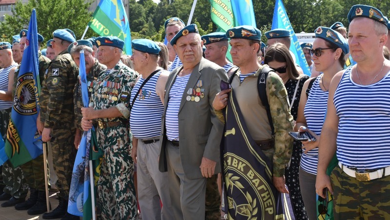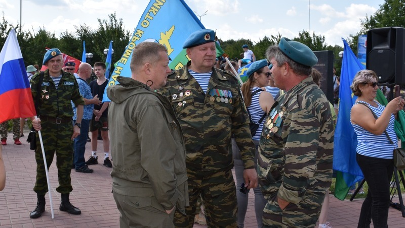 Торжественный митинг по традиции состоялся в сквере ВДВ «Никто, кроме нас!». Десантники приходили сюда семьями. В тельняшках, с флагами и цветами они постепенно заполнили площадь. Собравшиеся по-братски обнимались с однополчанами, вспоминали ратную молодость, фотографировались у памятника основателю ВДВ Василию Филипповичу Маргелову. Старший прапорщик запаса Александр Черкашин совершил более 150 прыжков. Служил в Афганистане в 1985-1987 годах. Владимир Горохов принимал участие в боевых действиях во вторую Чеченскую кампанию в начале 2000-х. Прошёл весь Северный Кавказ. Роман Быковский нёс службу в 13-й бригаде в Амурской области. Говорит, что служба для него была уроком мужества. Сегодня наши десантники участвуют в специальной военной операции на Украине, проявляя мужество и отвагу. В их числе боец с позывным «Юшка». Воевал в Чечне, на Украине на Бахмутском направлении. Сейчас выполняет боевое задание в одной из африканских стран. Ему и ещё одному участнику СВО было доверено поднять флаги Российской Федерации и Воздушно-десантных войск.