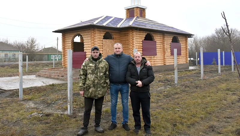 «Вначале установили поклонный крест на въезде в село, потом облагородили родник – расчистили, установили лестничные пролёты, поставили беседку с маковкой. Друзья помогали, благочинный освятил, – вспоминает Михаил Котарев. – А потом настала очередь храма-часовни. Первым делом привели в порядок заброшенный участок – выкорчевали разросшийся клён, спланировали площадку и залили фундамент. Решили не спешить с работами, а сделать всё основательно и достойно. Место выбрали удачное – рядом со школой и памятником нашим землякам-участникам Великой Отечественной войны. 2 августа 2022 года митрополит Белгородский и Старооскольский Иоанн совершил чин освящения закладного камня в основание храма-часовни».