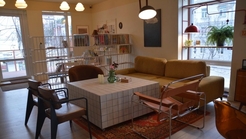 Пространство кофейни разделено на два зала, в одном из которых звучит музыка, а во втором, поменьше, можно поработать или пообщаться в тишине. Второй зал оборудован всем необходимым для проведения мастер-классов: есть большой стол, мойка и места хранения для расходных материалов. Именно возможность сочетать отдых с творчеством стала одним из тех преимуществ, благодаря которым проект удостоился муниципального гранта.