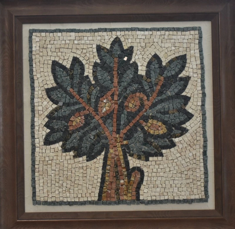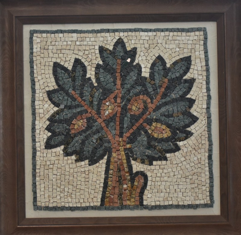 В мастерской почётное место занимает картина, исполненная в технике римской мозаики. На ней изображено ветвистое дерево с плодами. Это одна из любимых работ Елены. Она не продаётся. Сюжет взят из декора итальянского храма – фрагмент панно, которое украшает древний образец зодчества. В римской мозаике определённый способ выкладки рисунка из колотых кусочков камня примерно одного размера: изображаемый объект сначала окружает ореол из тессер фонового оттенка, повторяя его форму, а дальше уже преобладает горизонтальное направление линий.