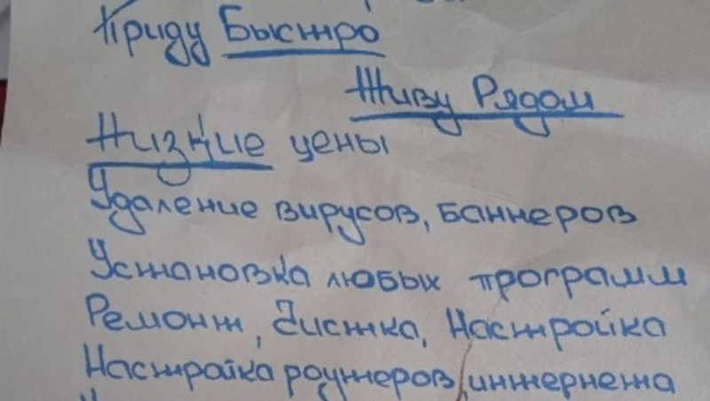 Старооскольские пенсионеры стали жертвами дорогостоящего мастера компьютерной техники. «Компьютерный мастер Сергей. Приду быстро. Живу рядом. Работаю без выходных…» – от руки написано на клочках бумаги, что висят на столбах и остановках, информационных досках у каждого подъезда огромной нашей страны, выпадают веером из почтовых ящиков. Именно такую рекламную листовку принесла с газетами домой старооскольская пенсионерка Нина Ивановна Кузнецова (имя и фамилия изменены – примеч. ред.). И однажды телефонный номер мастера пригодился.