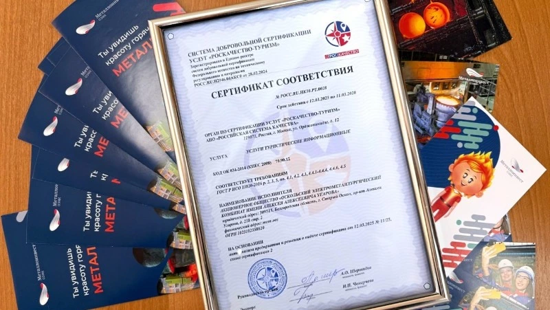 14 марта 2025 г., Старый Оскол – Оскольский электрометаллургический комбинат им. А. А. Угарова (входит в компанию «Металлоинвест») первым в стране успешно прошёл сертификацию на соответствие ГОСТ Р ИСО 13810-2016 «Туристские услуги. Промышленный туризм. Предоставление услуг». Соответствующий документ представители Роскачества вручили управлению по туризму Белгородской области 14 марта в Нижнем Новгороде на Международном форуме гостеприимства регионов «Интурмаркет».