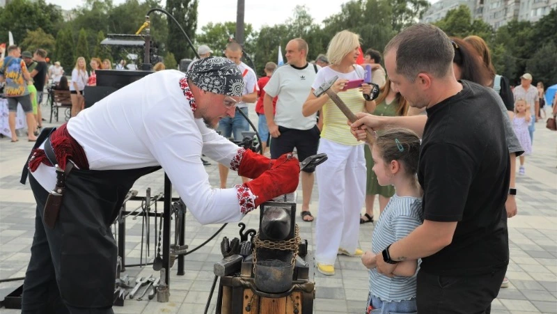 Главная городская площадь превратилась в территорию творчества и интерактива. Гости погрузились в мир металлургических ремёсел: на выставке «Изящное ремесло» кузнецы демонстрировали мастерство, а в зоне «Золотые руки» мастера Белгородской области проводили мастер-классы по народным промыслам.