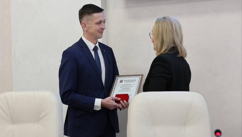 Заместитель губернатора Белгородской области по внутренней политике Ольга Медведева от лица губернатора поблагодарила Андрея Чеснокова за работу Она передала ему почётную грамоту за вклад в социально-экономическое развитие Старооскольского городского округа.