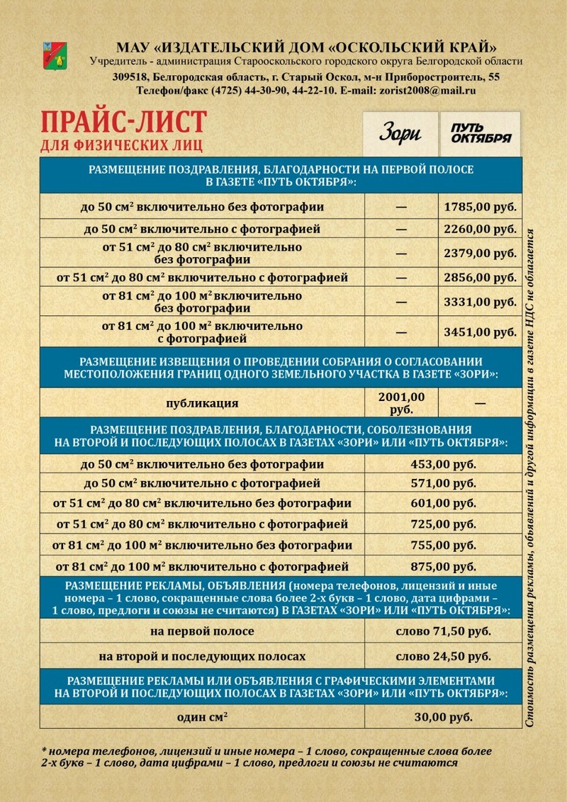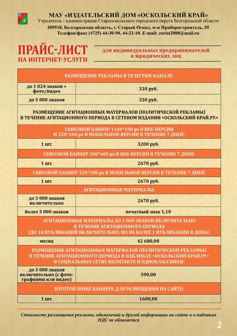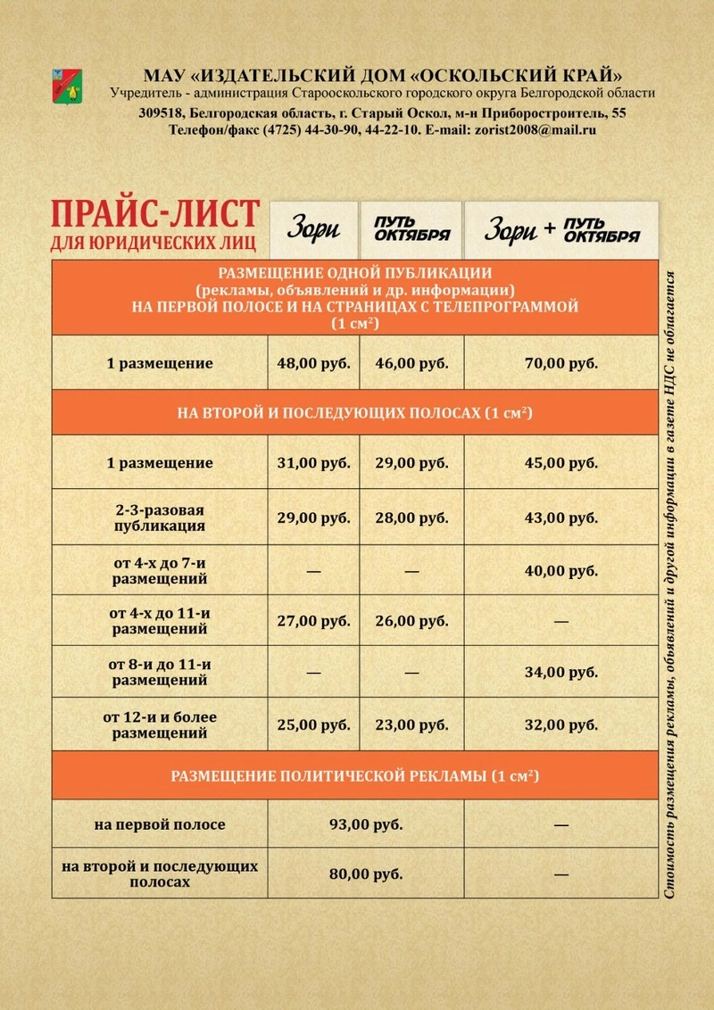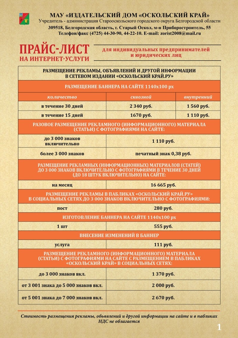 Стоимость размещения рекламы, объявлений и другой информации в газете НДС не облагается. (Основание: Постановление администрации Старооскольского городского округа Белгородской области от 28 декабря 2017 года № 5281)